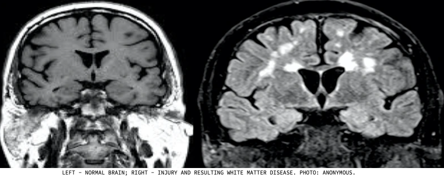 When we use MRIs to look at the brains of people with certain conditions like multiple sclerosis, we can see something called white matter disease. This shows up as white blobs on the MRI, and it's basically scarring or dead tissue. It happens because the immune system mistakenly attacks the brain.
